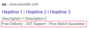 Callout extensions are short, non-clickable, snippets of text — just 25 characters long — that highlight your business features and unique selling propositions. Callouts should be specific and give users more information such as “Free Delivery” or “24/7 Support.” Google may show up to ten callouts with your ad and Microsoft shows a maximum of four.