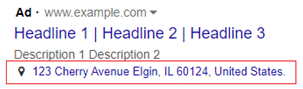 Location extensions show the physical address of your business. Users can click to get further information such as a map to your location or the distance to your business.