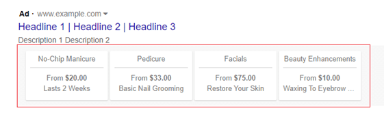 Price extensions show searchers the price of your products or services alongside your ad. They consist of a header and short description (25 characters for each), price, and a final URL.