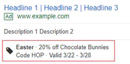 Promotion extensions can include a promo code, valid dates, and the occasion the sale is running for such as Easter, Halloween, Christmas, and others. This type of extension also features either a percent or monetary discount as well as a final URL to the page on your site that highlights the promotion.