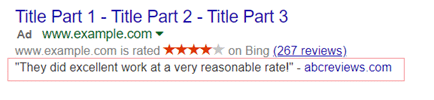 Review extensions display positive reviews, awards, or rankings from a reputable, third-party source. Clicking sends the user to the third-party review site, and not to a final URL of your choice. Similar to seller ratings, there’s no charge when clicked. Review extensions are only available in Microsoft and are served everywhere except in China.