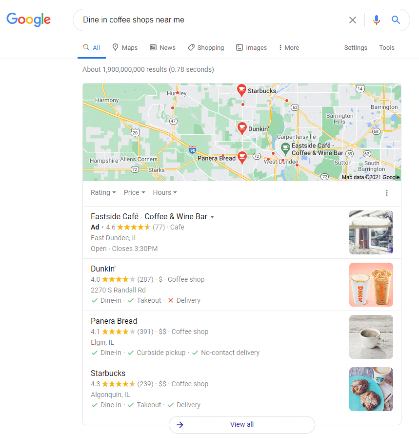 This provides a second paid opportunity on the SERP as the text ad is eligible to run on the same results page as the GMB information, increasing your advertising presence.