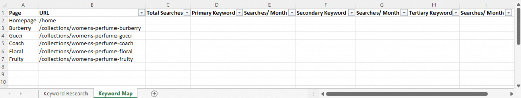 Use Excel to create an organized keyword map. The goal is to identify three relevant keywords in the same theme for each page, so include these nine key headings in your keyword map spreadsheet: