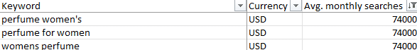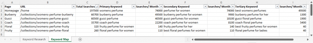 In the example above, we are using a women’s perfume ecommerce site. Start by filtering the keyword research for concepts that are relevant to a specific page, and decide what makes sense as the logical keyword theme for that page. You’ll want to pay close attention to the keywords and the column with the average monthly searches. Make sure that this column stays filtered from largest to smallest so you can tell at a glance which keywords drive the most searches.