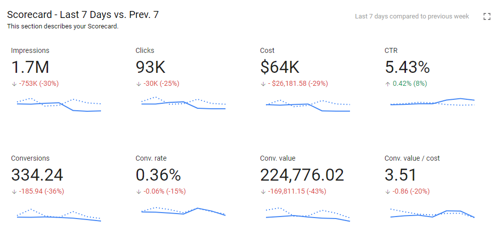 I use scorecards to get a quick update of recent performance versus the previous period – such as the last seven days versus the previous seven days shown above. Adding percent changes and sparklines helps me quickly digest account performance trends.