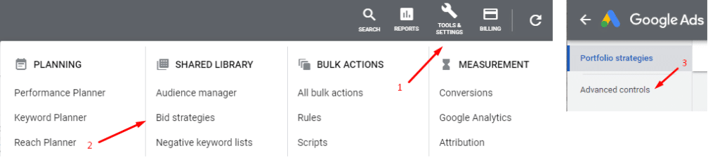 Again, you can find both of these Google Ads advanced bid controls under Tools & Settings 🡪Shared library 🡪 Bid strategies 🡪 Advanced controls.