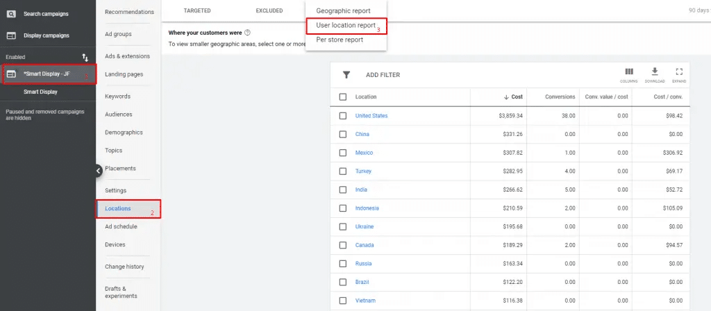 Once, not that long ago (I would guess within the last two months), you could look in the Location tab of Google Ads and see where traffic was coming from using the user location report. Great at letting me see if I was getting clicks outside my targeted area — whether other countries or other states or even cities — the location report was quick and easy. It allowed me to take action by clicking the locations I didn’t want and instantly adding them as exclusions.