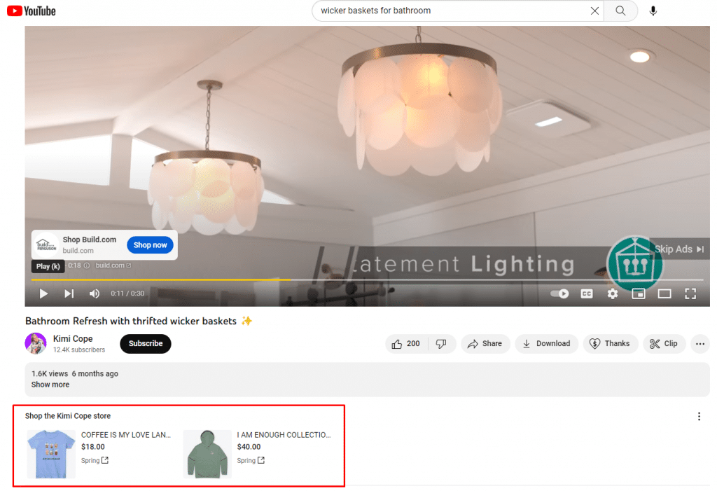 YouTube: available in select countries with “strong trust signals;” YouTube watchers can see product images below or next to a video with products for sale. Additionally, searches on YouTube for products can also bring up items available for purchase.