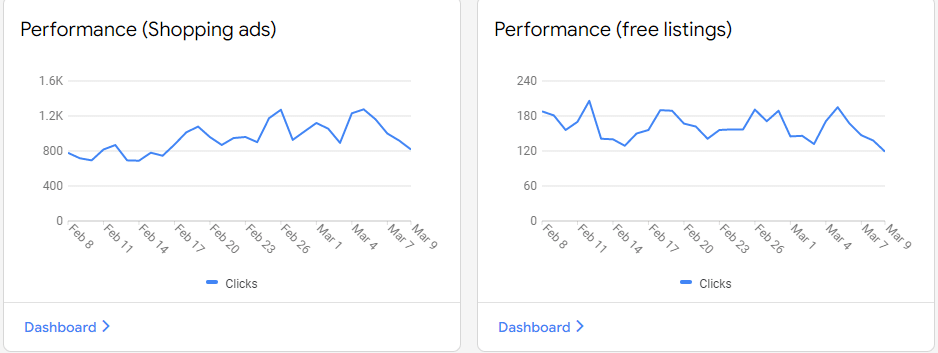 When we head into the Dashboard for the free listings, we get the following detail for the last seven days for the same client as above. You’ll see no segmentation for the different places we list above, but you will see traffic results as well as conversions, which is an update since our last blog. The conversion data comes from GA4 Analytics, so you’ll have to have that set up, configured for a purchase event, and linked to your Google Merchant Center account.