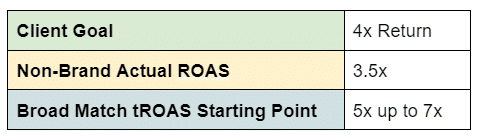 Ecommerce? Start with tROAS. Lead-based? Start with tCPA. This is important, as you want to get as close to your goal as possible. Once you have selected your Smart Bidding strategy, the next step is to set your goal. What I will typically do with my Broad Match campaign is set a tROAS goal higher than the average non-brand actual ROAS OR 1.5x-2x your goal. Below is a quick chart detailing my logic: