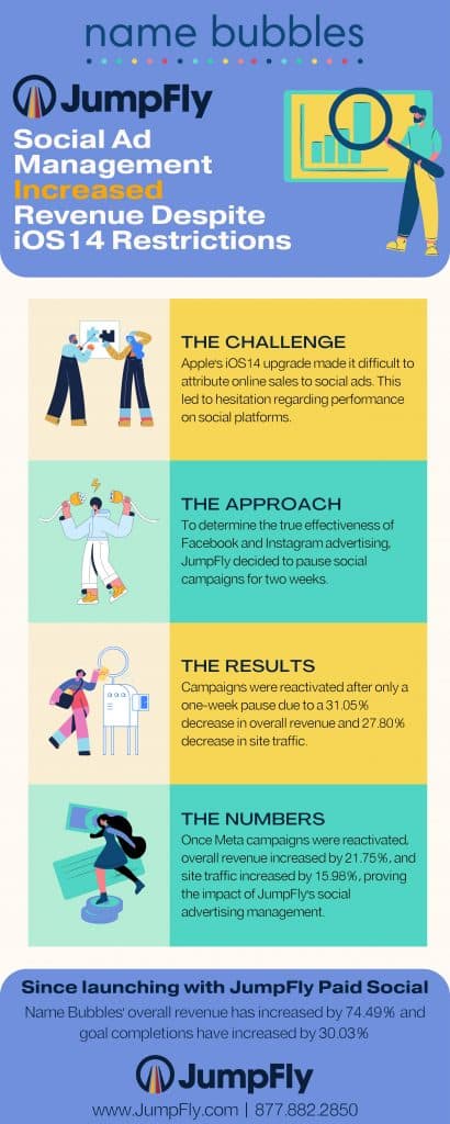 All in all, JumpFly’s social ad management services drove a substantial increase in revenue and sales. Understanding the challenges iOS 14 brought on for reporting across platforms, Name Bubbles is a great example of looking at the bigger picture. Showcasing that although visibility may be limited, social ads are powering sales and contributing to the overall success of the company.