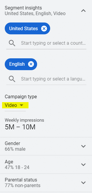 Another important note—towards the right of the screenshot above, you’ll want to click “Segment insights” and then pick the “campaign type” dropdown to select “Video.” Remember, we’re creating a YouTube campaign with this audience, so selecting Video will reveal what you can expect in terms of volume for that particular campaign type. Expect the audience size to shrink a bit when isolating the projection to just Video: