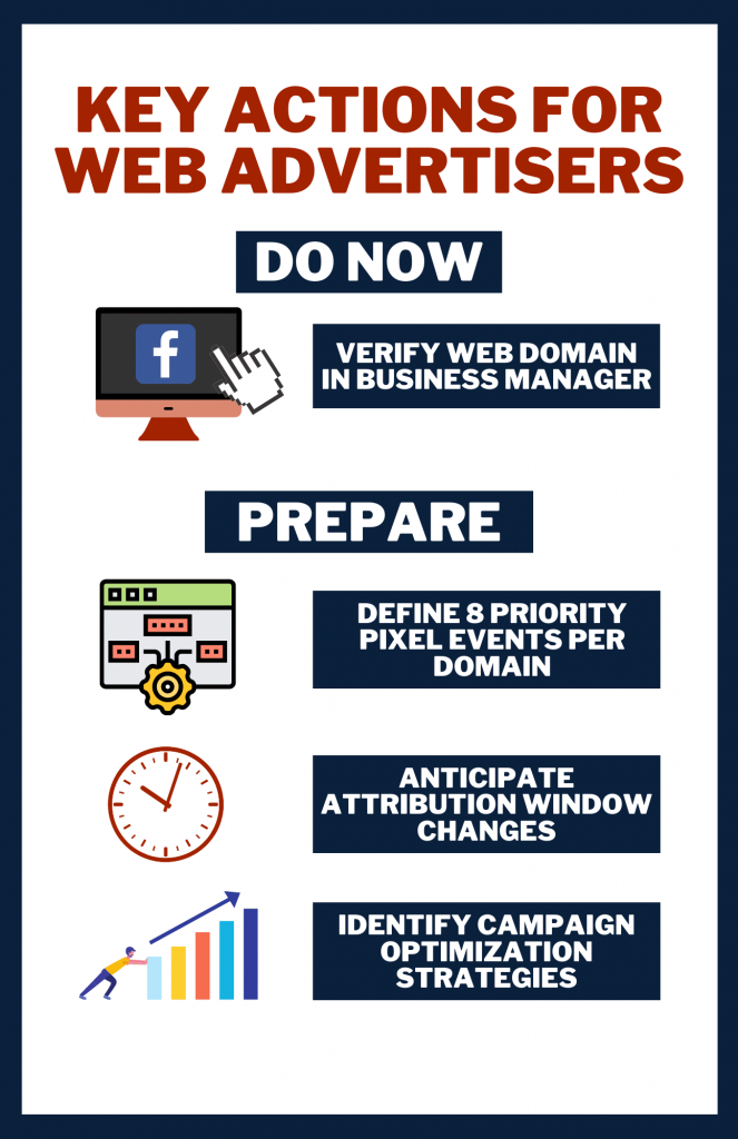 Now that we’ve summarized the changes, let’s go over what you can do now to prepare. In summary, you’ll need to make sure your web domain is verified in Business Manager, start preparing your list of eight priority pixel events, and prepare for the changes to attribution windows and campaign strategies.